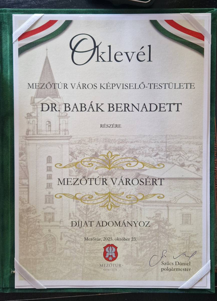 A díjazottak között szerepel Dr. Babák Bernadett a Hospice Osztály osztályvezető főorvos, aki „Mezőtúr Városért” díjban részesült.